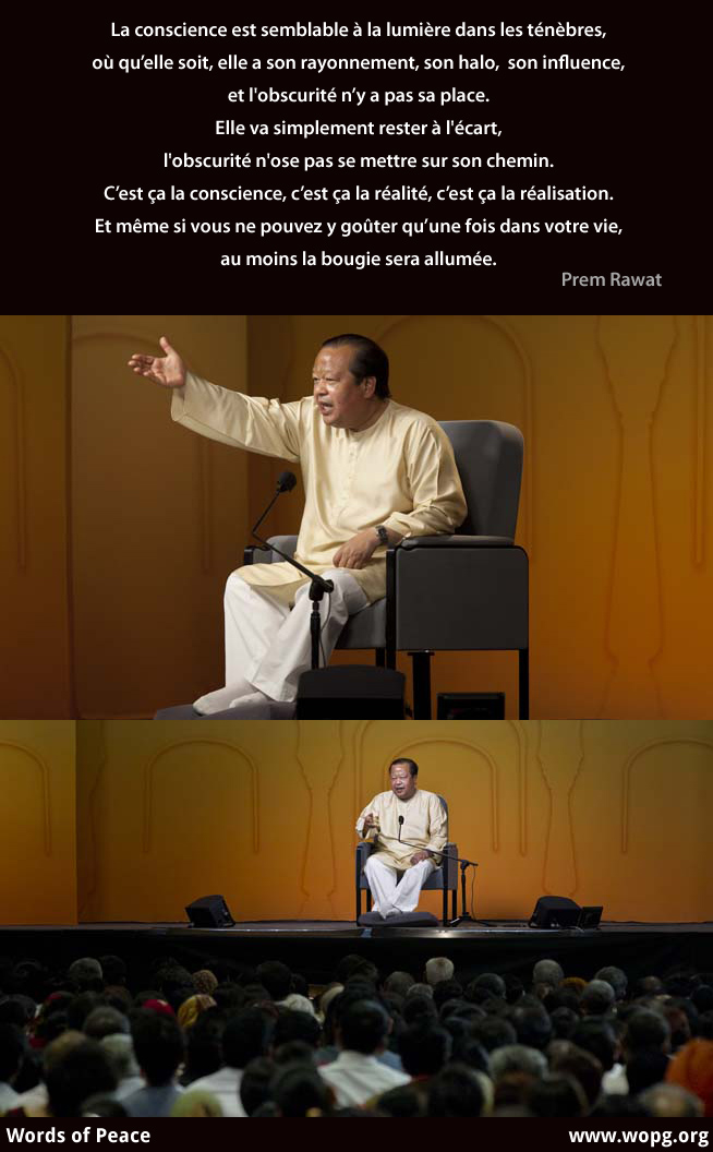 La conscience est semblable à la lumière dans les ténèbres, où qu’elle soit, elle a son rayonnement, son halo, son influence, et l'obscurité n’y trouve pas sa place. Emmenez-la partout où vous pouvez. Elle va simplement se tenir à l'écart, l'obscurité n'ose pas se mettre sur son chemin. C’est ça la conscience, c’est ça la réalité, c’est ça la réalisation. Et même si vous ne pouvez y goûter qu’une fois dans votre vie, au moins la bougie sera allumée.