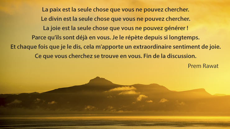 La paix est la seule chose que vous ne pouvez chercher. Le divin est la seule chose que vous ne pouvez chercher. La joie est la seule chose que vous ne pouvez générer ! Parce qu’ils sont déjà en vous. Je le répète depuis si longtemps. Et chaque fois que je le dis, cela m’apporte un extraordinaire sentiment de joie. Ce que vous cherchez se trouve en vous. Fin de la discussion.