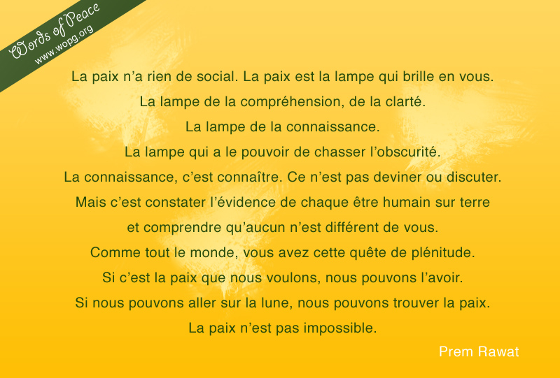 La paix n’a rien de social. La paix est la lampe qui brille en vous. La lampe de la compréhension, de la clarté. La lampe de la connaissance. La lampe qui a le pouvoir de chasser l’obscurité. La connaissance, c’est connaître. Ce n’est pas deviner ou discuter. Mais c’est constater l’évidence de chaque être humain sur terre et comprendre qu’aucun n’est différent de vous. Comme tout le monde, vous avez cette quête de plénitude. Si c’est la paix que nous voulons, nous pouvons l’avoir. Si nous pouvons aller sur la lune, nous pouvons trouver la paix. La paix n’est pas impossible.