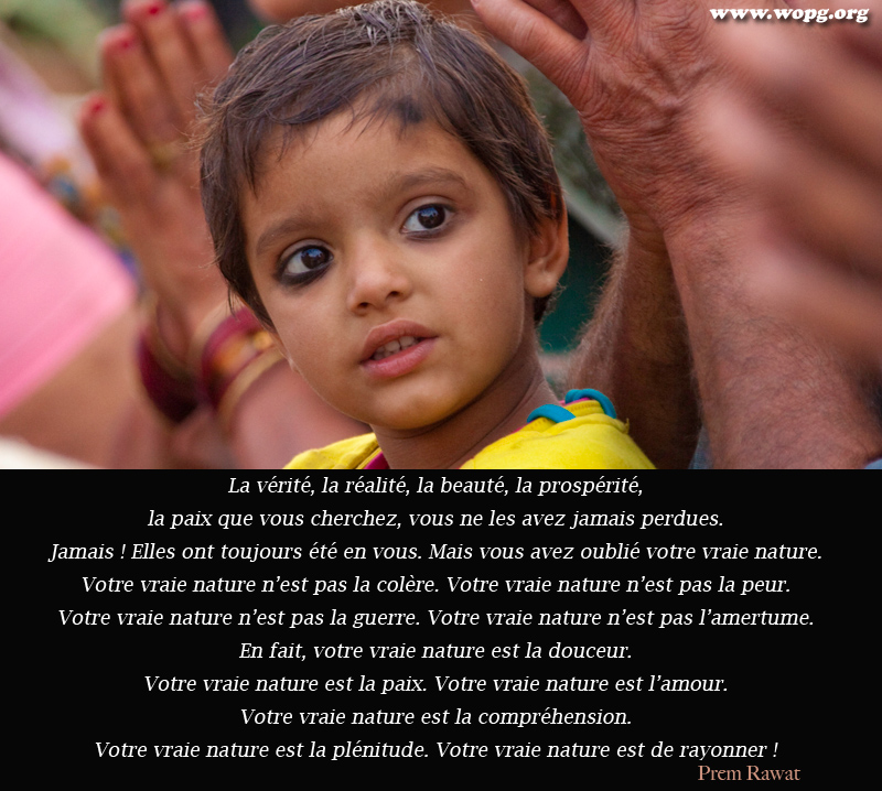 La vérité, la réalité, la beauté, la prospérité, la paix que vous cherchez, vous ne les avez jamais perdues. Jamais ! Elles ont toujours été en vous. Mais vous avez oublié votre vraie nature. Votre vraie nature n’est pas la colère. Votre vraie nature n’est pas la peur. Votre vraie nature n’est pas la guerre. Votre vraie nature n’est pas l’amertume. En fait, votre vraie nature est la douceur. Votre vraie nature est la paix. Votre vraie nature est l’amour. Votre vraie nature est la compréhension. Votre vraie nature est la plénitude. Votre vraie nature est de rayonner !