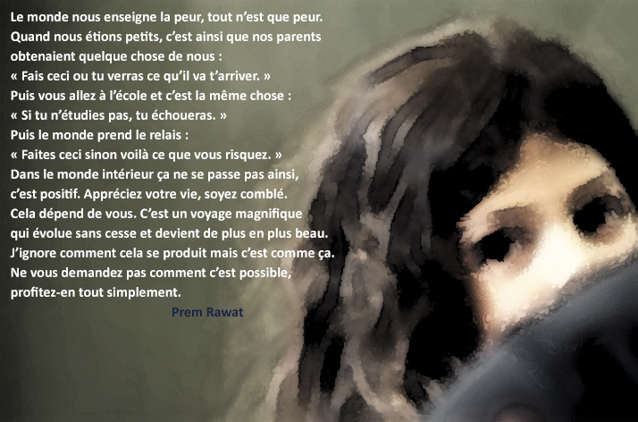 Le monde nous enseigne la peur, tout n’est que peur. Quand nous étions petits, c’est ainsi que nos parents obtenaient quelque chose de nous : « Fais ceci ou tu verras ce qu’il va t’arriver. » Puis vous allez à l’école et c’est la même chose : « Si tu n’étudies pas, tu échoueras. » Puis le monde prend le relais : « Faites ceci sinon voilà ce que vous risquez. » Dans le monde intérieur ça ne se passe pas ainsi, c’est positif. Appréciez votre vie, soyez comblé. Cela dépend de vous. C’est un voyage magnifique qui évolue sans cesse et devient de plus en plus beau. J’ignore comment cela se produit mais c’est comme ça. Ne vous demandez pas comment c’est possible, profitez-en tout simplement.