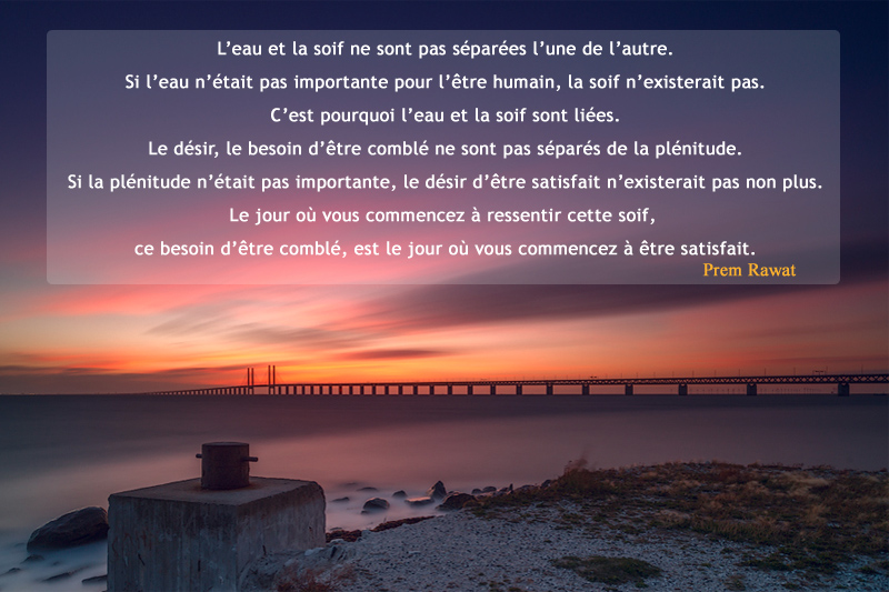L’eau et la soif ne sont pas séparées l’une de l’autre. Si l’eau n’était pas importante pour l’être humain, la soif n’existerait pas. C’est pourquoi l’eau et la soif sont liées. Le désir, le besoin d’être comblé ne sont pas séparés de la plénitude. Si la plénitude n’était pas importante, le désir d’être satisfait n’existerait pas non plus. Le jour où vous commencez à ressentir cette soif, ce besoin d’être comblé, est le jour où vous commencez à être satisfait.