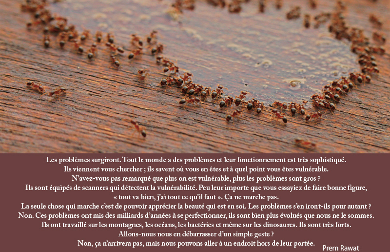 Les problèmes surgiront. Tout le monde a des problèmes et leur fonctionnement est très sophistiqué. Ils viennent vous chercher ; ils savent où vous en êtes et à quel point vous êtes vulnérable. N’avez-vous pas remarqué que plus on est vulnérable, plus les problèmes sont gros ? Ils sont équipés de scanners qui détectent la vulnérabilité. Peu leur importe que vous essayiez de faire bonne figure, « tout va bien, j’ai tout ce qu’il faut ». Ça ne marche pas. La seule chose qui marche c’est de pouvoir apprécier la beauté qui est en soi. Les problèmes s’en iront-ils pour autant ? Non. Ces problèmes ont mis des milliards d’années à se perfectionner, ils sont bien plus évolués que nous ne le sommes. Ils ont travaillé sur les montagnes, les océans, les bactéries et même sur les dinosaures. Ils sont très forts. Allons-nous nous en débarrasser d’un simple geste ? Non, ça n’arrivera pas, mais nous pouvons aller à un endroit hors de leur portée.