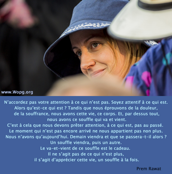 N’accordez pas votre attention à ce qui n’est pas. Soyez attentif à ce qui est. Alors qu’est-ce qui est ? Tandis que nous éprouvons de la douleur, de la souffrance, nous avons cette vie, ce corps. Et, par dessus tout, nous avons ce souffle qui va et vient. C’est à cela que nous devons prêter attention, à ce qui est, pas au passé. Le moment qui n’est pas encore arrivé ne nous appartient pas non plus. Nous n’avons qu’aujourd’hui. Demain viendra et que se passera-t-il alors ? Un souffle viendra, puis un autre. Le va-et-vient de ce souffle est le cadeau. Il ne s’agit pas de ce qui n’est plus, il s’agit d’apprécier cette vie, un souffle à la fois.