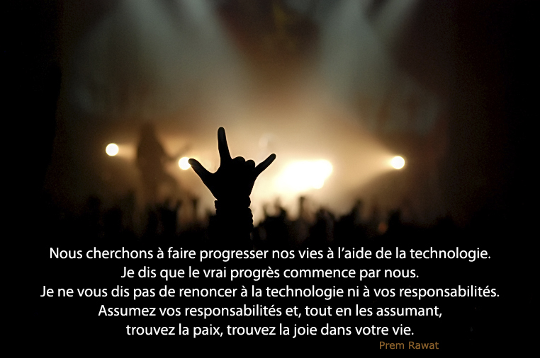 Nous cherchons à faire progresser nos vies à l’aide de la technologie. Je dis que le vrai progrès commence par nous. Je ne vous dis pas de renoncer à la technologie ni à vos responsabilités. Assumez vos responsabilités et, tout en les assumant, trouvez la paix, trouvez la joie dans votre vie.