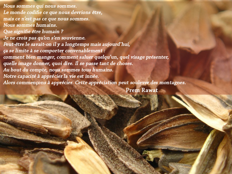 Nous sommes qui nous sommes. Le monde codifie ce que nous devrions être, mais ce n’est pas ce que nous sommes. Nous sommes humains. Que signifie être humain ? Je ne crois pas qu’on s’en souvienne. Peut-être le savait-on il y a longtemps mais aujourd’hui, ça se limite à se comporter convenablement : comment bien manger, comment saluer quelqu’un, quel visage présenter, quelle image donner, quoi dire. Il se passe tant de choses. Au bout du compte, nous sommes tous humains. Notre capacité à apprécier la vie est innée. Alors commençons à apprécier. Cette appréciation peut soulever des montagnes.