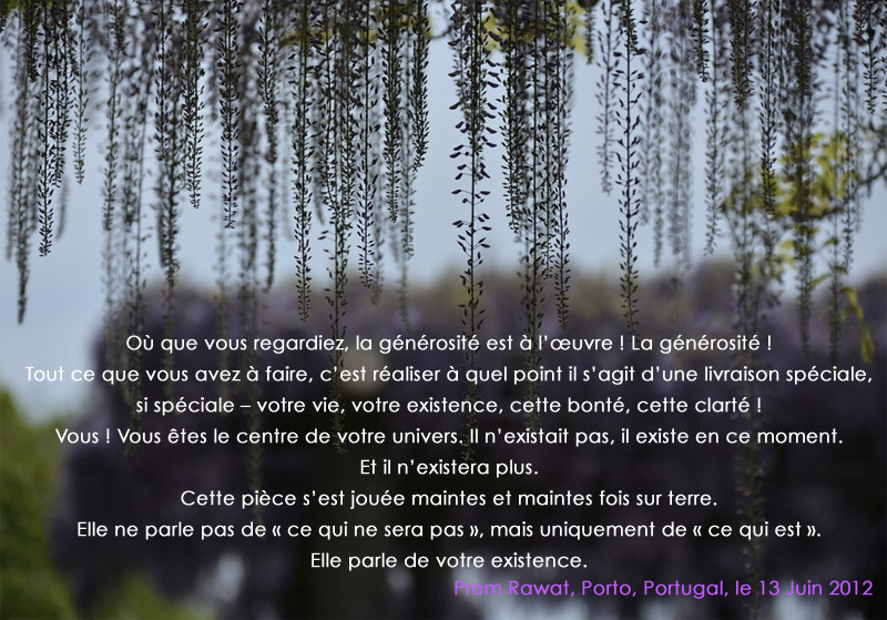 Où que vous regardiez, la générosité est à l’œuvre ! La générosité ! Tout ce que vous avez à faire, c’est réaliser à quel point il s’agit d’une livraison spéciale, Vraiment spéciale – votre vie, votre existence, cette bonté, cette clarté ! Vous ! Vous êtes le centre de votre univers. Il n’existait pas. Il existe en ce moment. Et il n’existera plus. Cette pièce s’est jouée maintes et maintes fois sur terre. Elle ne parle pas de « ce qui ne sera pas », mais uniquement de « ce qui est ». Elle parle de votre existence.