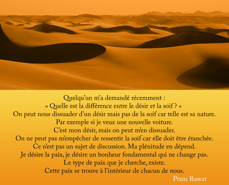 Quelqu’un m’a demandé récemment : « Quelle est la différence entre le désir et la soif ? » On peut nous dissuader d’un désir mais pas de la soif car telle est sa nature. Par exemple si je veux une nouvelle voiture. C’est mon désir, mais on peut m’en dissuader. On ne peut pas m’empêcher de ressentir la soif car elle doit être étanchée. Ce n’est pas un sujet de discussion. Ma plénitude en dépend. Je désire la paix, je désire un bonheur fondamental qui ne change pas. Le type de paix que je cherche, existe. Cette paix se trouve à l’intérieur de chacun de nous.
