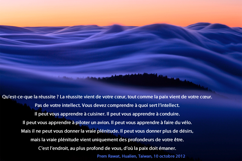 Qu’est-ce-que la réussite ? La réussite vient de votre cœur, tout comme la paix vient de votre cœur. Pas de votre intellect. Vous devez comprendre à quoi sert l’intellect. Il peut vous apprendre à cuisiner. Il peut vous apprendre à conduire. Il peut vous apprendre à piloter un avion. Il peut vous apprendre à faire du vélo. Mais il ne peut vous donner la vraie plénitude. Il peut vous donner plus de désirs, mais la vraie plénitude vient uniquement des profondeurs de votre être. C’est l’endroit, au plus profond de vous, d’où la paix doit émaner.