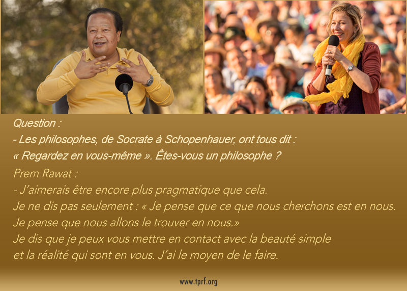 Prem Rawat : - J’aimerais être encore plus pragmatique que cela. Je ne dis pas seulement : « Je pense que ce que nous cherchons est en nous. Je pense que nous allons le trouver en nous.» Je dis que je peux vous mettre en contact avec la beauté simple et la réalité qui sont en vous. J’ai le moyen de le faire.