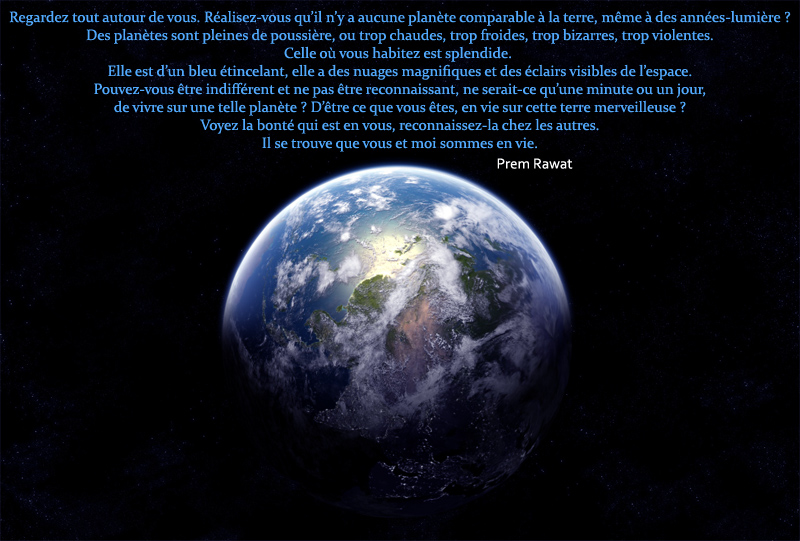 Regardez tout autour de vous. Réalisez-vous qu’il n’y a aucune planète comparable à la terre, même à des années-lumière ? Des planètes sont pleines de poussière, ou trop chaudes, trop froides, trop bizarres, trop violentes. Celle où vous habitez est splendide. Elle est d’un bleu étincelant, elle a des nuages magnifiques et des éclairs visibles de l’espace. Pouvez-vous être indifférent et ne pas être reconnaissant, ne serait-ce qu’une minute ou un jour, de vivre sur une telle planète ? D’être ce que vous êtes, en vie sur cette terre merveilleuse ? Voyez la bonté qui est en vous, reconnaissez-la chez les autres. Il se trouve que vous et moi sommes en vie.