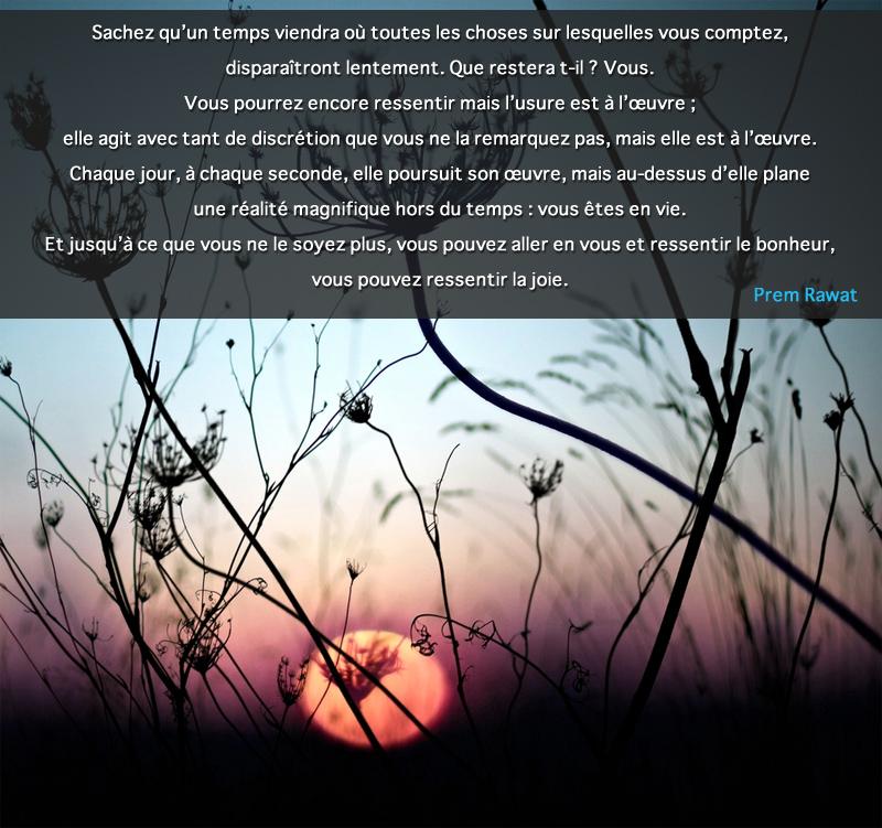 Sachez qu’un temps viendra où toutes les choses sur lesquelles vous comptez, disparaîtront lentement. Que restera t-il ? Vous. Vous pourrez encore ressentir mais l’usure est à l’œuvre ; elle agit avec tant de discrétion que vous ne la remarquez pas, mais elle est à l’œuvre. Chaque jour, à chaque seconde, elle poursuit son œuvre, mais au-dessus d’elle plane une réalité magnifique hors du temps : vous êtes en vie. Et jusqu’à ce que vous ne le soyez plus, vous pouvez aller en vous et ressentir le bonheur, vous pouvez ressentir la joie.