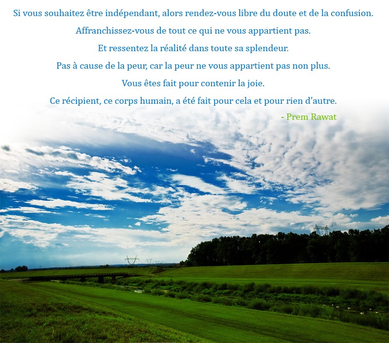 Si vous souhaitez être indépendant, alors rendez-vous libre du doute et de la confusion. Affranchissez-vous de tout ce qui ne vous appartient pas. Et ressentez la réalité dans toute sa splendeur. Pas à cause de la peur, car la peur ne vous appartient pas non plus. Vous êtes fait pour contenir la joie. Ce récipient, ce corps humain, a été fait pour cela et pour rien d’autre.