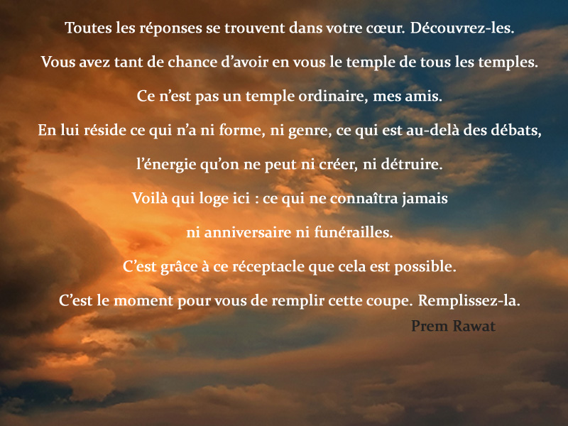 Toutes les réponses se trouvent dans votre cœur. Découvrez-les. Vous avez tant de chance d’avoir en vous le temple de tous les temples. Ce n’est pas un temple ordinaire, mes amis. En lui réside ce qui n’a ni forme, ni genre, ce qui est au-delà des débats, l’énergie qu’on ne peut ni créer, ni détruire. Voilà qui loge ici : ce qui ne connaîtra jamais ni anniversaire ni funérailles. C’est grâce à ce réceptacle que cela est possible. C’est le moment pour vous de remplir cette coupe. Remplissez-la.