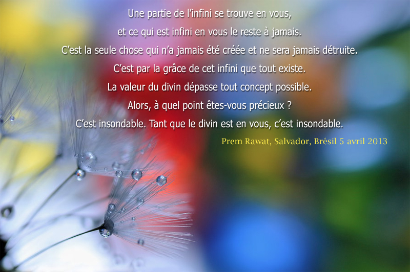 Une partie de l’infini se trouve en vous, et ce qui est infini en vous le reste à jamais. C’est la seule chose qui n’a jamais été créée et ne sera jamais détruite. C’est par la grâce de cet infini que tout existe. La valeur du divin dépasse tout concept possible. Alors, à quel point êtes-vous précieux ? C’est insondable. Tant que le divin est en vous, c’est insondable.