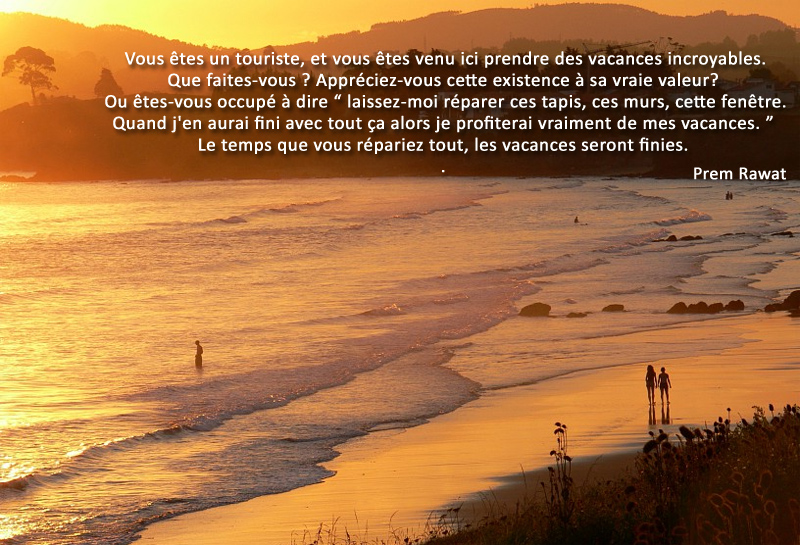 Vous êtes un touriste, et vous êtes venu ici prendre des vacances incroyables. Que faites-vous ? Appréciez-vous cette existence à sa vraie valeur? Ou êtes-vous occupé à dire “ laissez-moi réparer ces tapis, ces murs, cette fenêtre. Quand j'en aurai fini avec tout ça alors je profiterai vraiment de mes vacances. ” Le temps que vous répariez tout, les vacances seront finies.