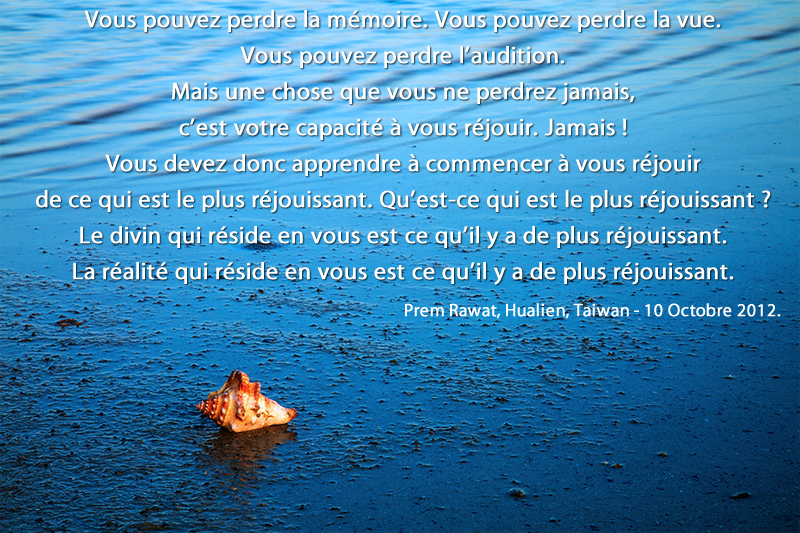 Vous pouvez perdre la mémoire. Vous pouvez perdre la vue. Vous pouvez perdre l’audition. Mais une chose que vous ne perdrez jamais, c’est votre capacité à vous réjouir. Jamais ! Vous devez donc apprendre à commencer à vous réjouir de ce qui est le plus réjouissant. Qu’est-ce qui est le plus réjouissant ? Le divin qui réside en vous est ce qu’il y a de plus réjouissant. La réalité qui réside en vous est ce qu’il y a de plus réjouissant.