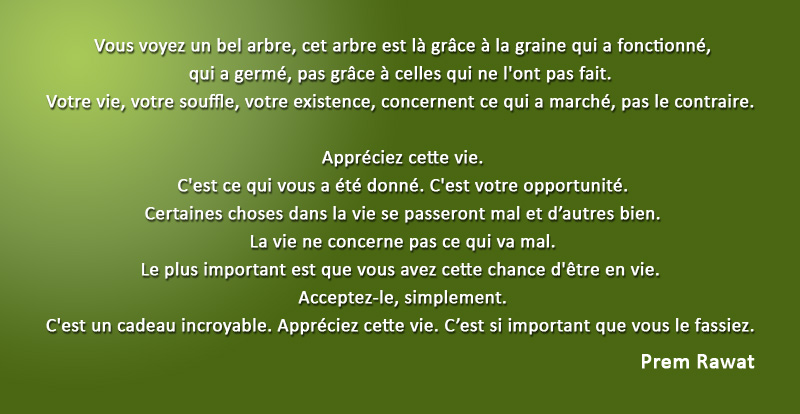 Appréciez cette vie. C'est ce qui vous a été donné. C'est votre opportunité. Certaines choses dans la vie se passeront mal et d’autres bien. La vie ne concerne pas ce qui va mal. Le plus important est que vous avez cette chance d'être en vie. Acceptez-le, simplement. C'est un cadeau incroyable. Appréciez cette vie. C’est si important que vous le fassiez.
